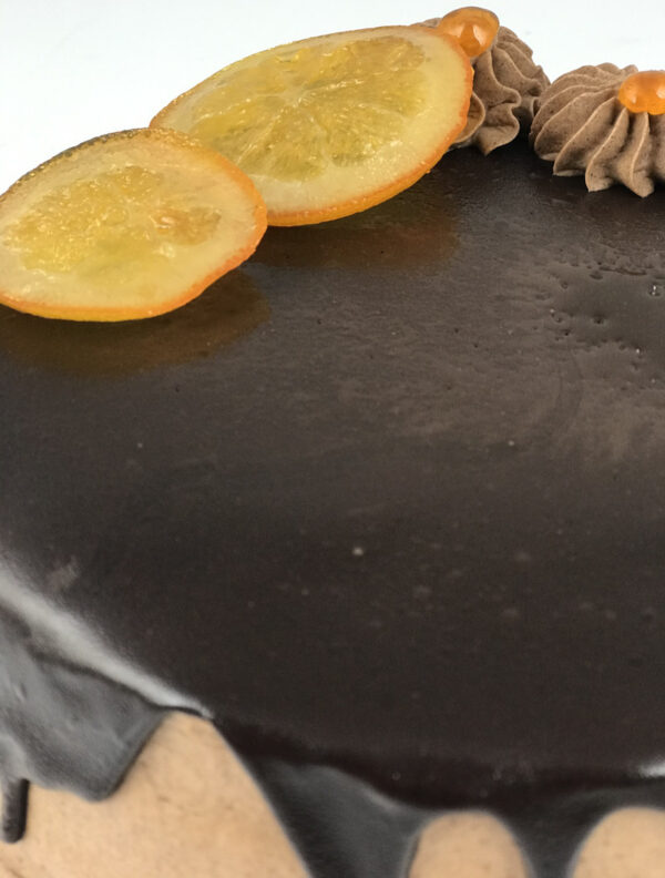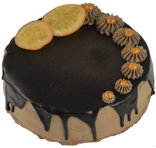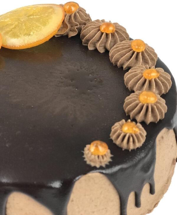 Un bizcocho de chocolate con trufa y una compota de naranja amarga que le da un contraste espectacular. Recubierto con una capa de chocolate a la avellana. Especial para paladares exigentes. Opcional sin frutos secos
